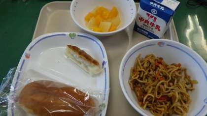 10月15日の給食は・・・ 公開日 2021/10/15 更新日 2021/10/15 お知らせ 10月15日の給食は、焼きそば、米粉パン、ぎょうざ、フルーツあえ、牛乳でした。子どもたちの大好きなメニューです。明日の運動会に向けて、もりもり食べました。