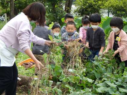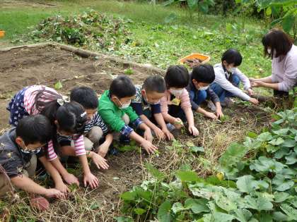 10月21日(木)、1年生が芋掘りをしました。1年生の子どもたちのたっぷりの愛情を受けて、芋たちも立派に生長しました。「あ〜、こんなところにもまだ芋があったー!」「先生、ここに芋が5つもあるよー」など、どの子も生き生きと嬉しそうに掘っていました。