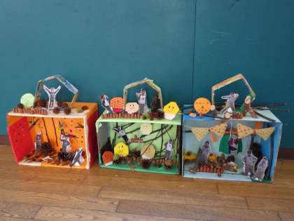 特別支援学級の子どもたちが、どんぐりや枯葉、松ぼっくりなど秋の植物を使って、オリジナルのミニハウスを作りました。「どんぐりの森ハウス」「ひみつの森ハウス」など、お気に入りの名前をつけて教室前に飾っていました。飾り方もあちこち工夫を凝らしていてとても可愛く仕上がっていました。