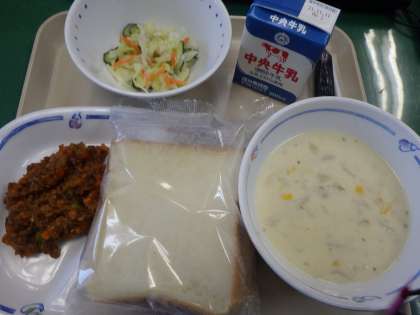 11月5日の給食は、コーンポタージュ、コールスローサラダ、スラッピージョー、スライスパン、コーヒー牛乳の素、牛乳でした。スラッピージョーは、子どもたちも大好きなメニューの一つです。パンにはさんで大きな口で「がぶっ」と頬張りました。