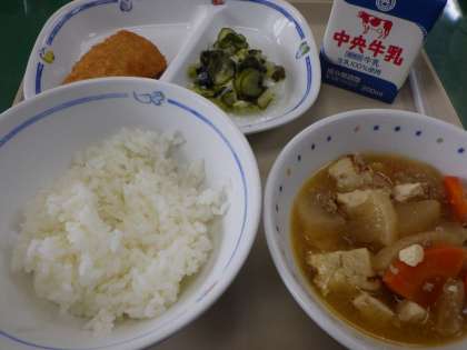 11月9日の給食は・・・ 公開日 2021/11/11 更新日 2021/11/11 お知らせ 11月9日の給食は、だいこんのそぼろ煮、酢の物、いか香味揚げ、ごはん、牛乳でした。だいこんのそぼろ煮はだいこんにだしがしみていてとても美味しかったです。寒い季節には、ぴったりの献立です。