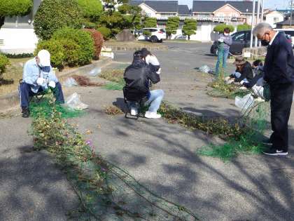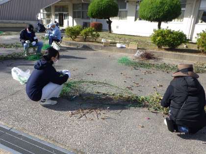地域学校共働本部のボランティアの皆さんによるアサガオのつるとり 公開日 2021/11/12 更新日 2021/11/12 各学年から 11月8日(月)、地域学校共働本部ボランティアの皆さんによる作業がありました。今回は、職員室前にあったアサガオ(緑のカーテン)のつるとりです。ネットにクルクルと巻き付いたつるを黙々ととっていく根気のいる作業。皆さんの頑張りのおかげで、予定時刻よりも早く作業を終えることができました。ありがとうございました。