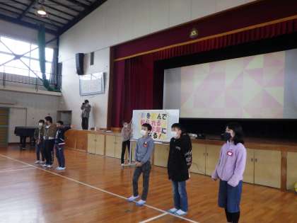 9時からは体育館で実行委員を中心に「始めの会」が行われました。まず、結キャンプデーに至るこれまでの活動・取り組みについて、ビデオで振り返りました。その後は、「ジェスチャー伝言ゲーム」を。各グループごとに分かれ、楽しくゲームをしました。