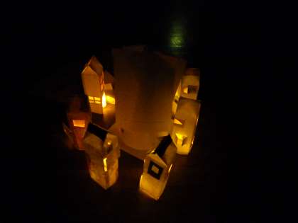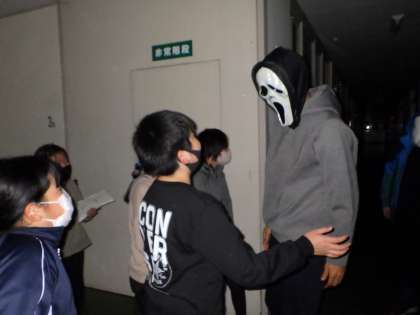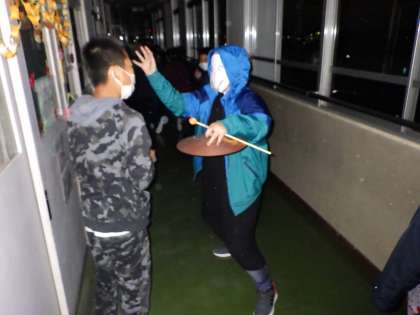 17時45分からは、チャレンジゲームときもだめしの時間です。2時間目に作った牛乳パックのランタンが真っ暗な体育館の中をほんのり照らしています。その周りをグループのみんなで囲み、楽しいゲームを行いました。同時に、順番に校舎内のきもだめしに出発。おばけ(先生たち?)も、気合を入れて子どもたちを驚かせました。「キャー!キャー!」子どもたちの叫び声が校舎内に響き渡りました。楽しい楽しい時間となりました。