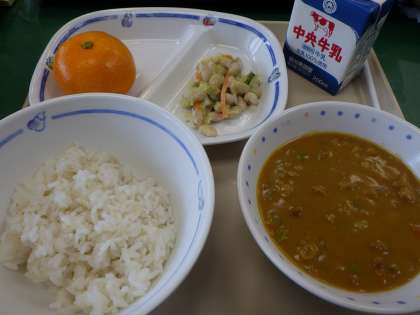 11月16日の給食は、カレーライス、麦ごはん、ビーンズサラダ、みかん、牛乳でした。15日から19日は日本型食生活週間ということで、主食のごはんを中心に栄養バランスに優れた献立が続きます。日本が長寿国なのは、食生活にその一因があると言われていて、国際的にも注目されているそうです。これからも日本型の食生活を大切にしていきたいですね。