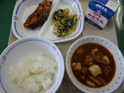 12月22日の給食は、かぼちゃのみそ汁、ごはん、はくさいのごまあえ、ぶりのゆず風味揚げ、牛乳でした。本日は、冬至献立ということで、ぶりのゆず風味揚げはカリッと揚がっていてとても美味しかったです。また、かぼちゃを食べるとかぜをひかないといわれていることから、まろやかなかぼちゃのみそ汁が献立に出ました。