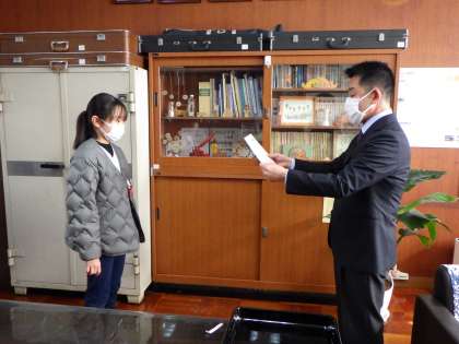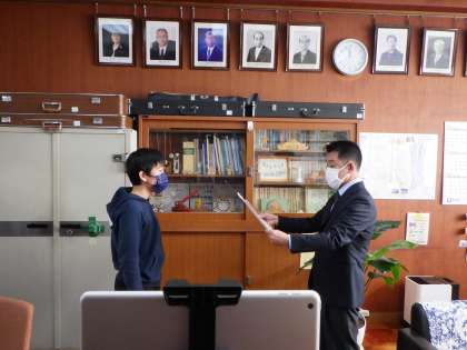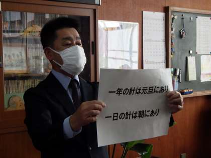 4時間目は冬休み前全校集会を行いました! 公開日 2021/12/23 更新日 2021/12/23 お知らせ 12月23日の4時間目に冬休み前の全校集会(リモート)を校長室で行いました。校長先生とのお昼のあいさつに続き、科学研究作品展の表彰を行いました。その後は、校長先生のお話がありました。今年の漢字は「金」でしたが、校長先生の今年の漢字は「動」ということで、その理由を紹介されていました。さらに、「門松」「しめ縄」「鏡もち」についてそれぞれの由来や意味についてくわしく紹介してくださいました。