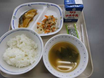1月11日の給食は、ごはん、雑煮、煮あえ、ぶりの照り焼き、味付けのり、牛乳でした。11日は、鏡開きということで、雑煮などが出る鏡開き献立でした。白玉の入ったお雑煮、とても美味しくいただきました。