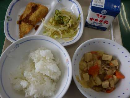 1月24日の給食は、高野豆腐のうま煮、たくあんあえ、にぎすフライ(ウスターソース)、ごはん、牛乳でした。24日から28日は全国学校給食週間です。日本の学校給食の発祥は、明治22年、山形県の小学校で始まったとされています。現在の給食は、バランスのよい食事の見本として「生きた教材」の役割を担っています。毎日、感謝していただきたいです。