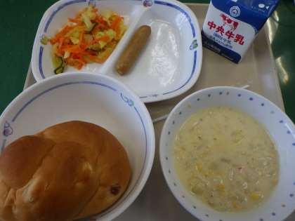 2月9日の給食は、コーンチャウダー、キャロットサラダ、ウインナー、りんごパン、牛乳でした。コーンチャウダーは、寒い日にぴったりのメニューです。りんごパンは、りんごの甘さがパンに広がり、ボリュームもあってとても美味しかったです。