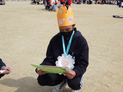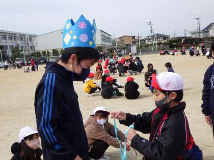 6年生を送る会 公開日 2022/03/11 更新日 2022/03/11 お知らせ 3月10日(木)の3・4時間目に延期になっていた「6年生を送る会」を実施しました。3時間目は、運動場に出てトロロ班での活動となりました。 1年生からは王冠、2年生からは首飾り、3年生からは6年生の似顔絵、4年生からは遊びの計画、準備、5年生からはプレゼントカードなど、それぞれの学年から心のこもったプレゼントがありました。 6年生はどの子も本当に嬉しそうな表情をしていました。