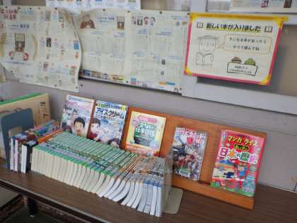 図書室前に新しく入った本の紹介や小学生が選んだ本のランキングの紹介コーナーがあります。こちらの掲示物は、司書さんや地域学校共働本部のボランティアさんたちが作成してくださっています。子どもたちには、これからもたくさんの本を読んでほしいです。