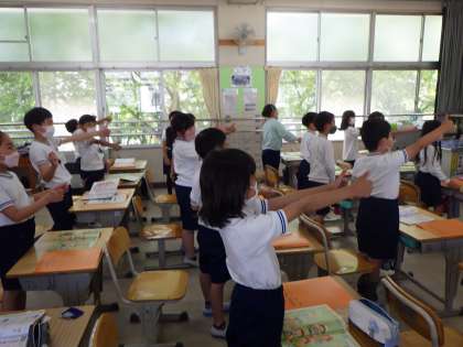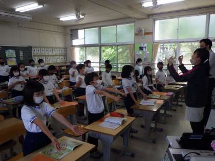 3年生の教室からとっても元気な英語の歌声が聞こえてきました。今日は、ALTのジェームズ先生と一緒に外国語活動です。「あいさつ」の練習を歌いながら覚えていました。