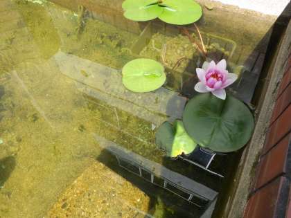 メダカは今日も元気にスイスイ泳いでいます。その横で、ピンクの蓮の花が咲いていました。輝くような美しさに思わずパチリ。メダカたちも何だか嬉しそうでした。