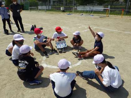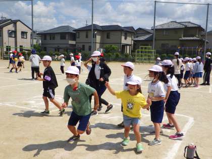 トロロっ子遊びでNケンじゃんけん。Nの線の上をケンケンで進んでいき、反対側から来た相手と出会ったところで「じゃんけん、ぽん!」