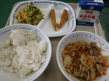 本日の献立は、麦ごはん、とよたひまわりポーク丼、チンゲンサイのごまあえ、めひかりフライ、牛乳でした。