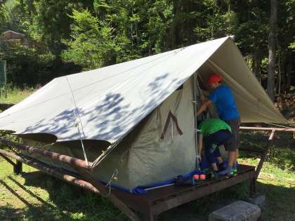 テントの中にマットを敷いたり、テントの外のクモの巣を取り除いたりしています