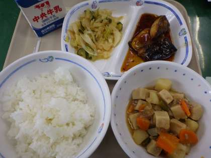 7月5日の給食は、ごはん、高野豆腐のうま煮、ごま酢あえ、さばの煮つけ、牛乳でした。給食の煮魚は、味付けが抜群。とても美味しいです。今日もありがとうございました。