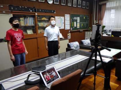 校長先生との元気なあいさつの後は、夏休みの思い出紹介を行いました。