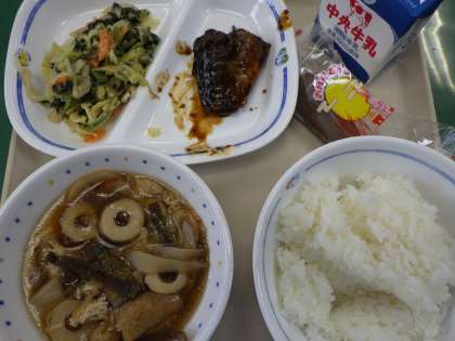 9月8日の給食は、ごはん、牛乳、のっぺい汁、野菜のねりごまあえ、さばのみそ煮、月見だんごでした。さばのみそ煮、甘辛くてとても美味しかったです。