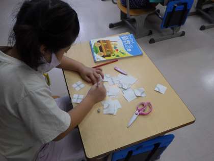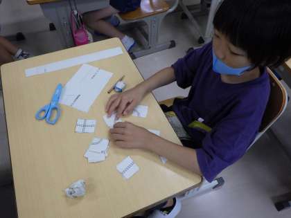 2年生の教室では算数の授業を行っていました。今日は、紙をつなぎ合わせて