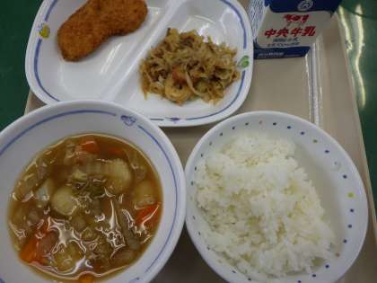 9月15日の給食は、ごはん、牛乳、玄米だんご汁、切干しだいこんのソース炒め、ささ身大葉梅肉フライでした。