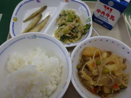 10月4日の給食は、ごはん、肉じゃが、チンゲンサイとツナのごまあえ、わかさぎのから揚げ、牛乳でした。
