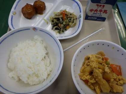 10月11日の給食は、ごはん、親子煮、のリ酢あえ、愛知の肉だんご、牛乳でした。