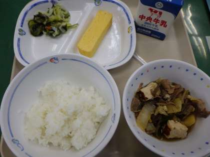 10月25日の給食は、ごはん、すきやき風煮、酢の物、厚焼き卵、牛乳でした。