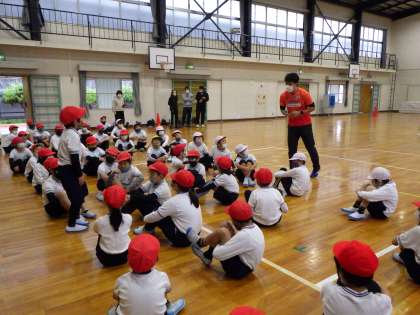 11月1日の2時間目に、3年生が走り方教室を実施しました。現役のオリンピック選手である川端魁人選手を講師にお迎えし、走り方のポイントをわかりやすく教えていただきました。