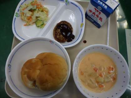 11月11日の給食は、キャロットポタージュ、りんごパン、コールスローサラダ、ハンバーグ(中濃ソース)、牛乳でした。りんごパンが出ました。とてもおいしかったです。