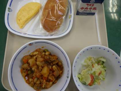 11月30日の給食は、ポークビーンズ、米粉パン、りんごサラダ、オムレツ、牛乳でした。