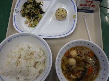 12月2日の給食は、中華飯、海藻サラダ、麦ごはん、黒こまだんご、牛乳でした。