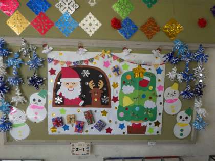 地域学校協働本部のボランティアの皆さんによる冬の掲示物が完成しました!