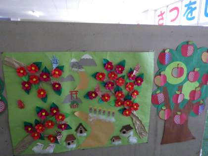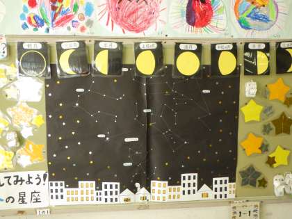 今回の掲示物もすごい!の一言。立体的なクリスマスツリーや椿の花、そして冬の星座は月の満ち欠けの様子など、子どもたちの生活や学習に関わるアイデア豊富なものばかり。