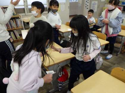 今日は、クリスマスが間近ということで、プレゼントの箱の絵が描かれたカードをたくさん集めます。じゃんけんをするときは、「フォーフォーフォー」と言いながら、じゃんけんポン!さあ、何枚集まったかな?