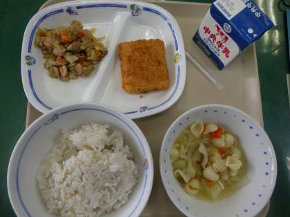 1月16日の給食はパスタスープ、きんぴらピラフ(麦ごはん)、たらフライ、牛乳でした。
