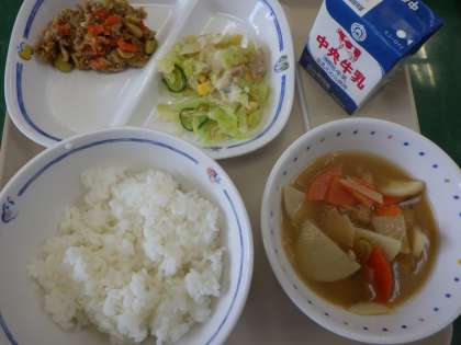 2月6日の給食は・・・ 公開日 2023/02/07 更新日 2023/02/07 お知らせ 2月6日の給食は、さといものみそ汁、ごはん、和風サラダ(和風ドレッシング)、大豆のピり辛炒め、牛乳でした。たべまるのおすすめ献立でした。