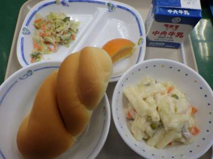 2月10日の給食は、マカロニのクリーム煮、ツイストパン、ツナサラダ、いよかん、牛乳でした。