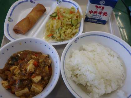 2月16日の給食は、麻婆豆腐、ごはん、中華あえ、春巻き、牛乳でした。今日もボリュームたっぷりでおいしかったです。