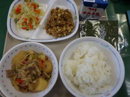 2月22日の給食は・・・ 公開日 2023/02/24 更新日 2023/02/24 お知らせ 2月22日の給食は、肉じゃが、ごはん、甘酢あえ、納豆、手巻きのり、牛乳でした。 納豆は、チーズが入っていておいしかったです。
