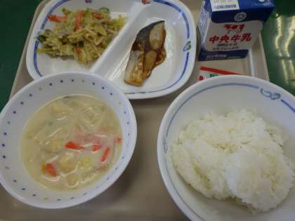 2月27日の給食は・・・ 公開日 2023/02/28 更新日 2023/02/28 お知らせ 2月27日の給食は、豆乳のバランスみそ汁、ごはん、ごぼうサラダ、ぶりの照り焼き、ふりかけ(野菜と雑穀)、牛乳でした。