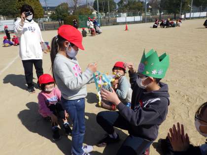 6年生を送る会、大成功!! 公開日 2023/03/06 更新日 2023/03/06 お知らせ 3月6日(月)の2・3時間目に延期になっていた「6年生を送る会」を実施しました。 第1部は、トロロ班に分かれ、全校児童が運動場に出てゲームなどを楽しみました。各学年の児童が作ったプレゼントや4年生が考えたゲームに6年生も大喜び。そして、5年生の頼もしい進行によりどの子も笑顔あふれるすばらしい会となりました。
