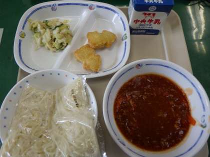 3月8日の給食は・・・ 公開日 2023/03/10 更新日 2023/03/10 お知らせ 3月8日の給食は、トマトソースかけ、ソフトめん、ツナサラダ、いかナゲット、牛乳でした。子どもたちの大好きなトマトソースのスパゲティでした。