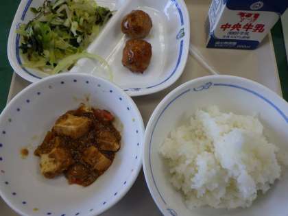 3月14日の給食は、生揚げのみそ炒め、ごはん、キャベツの昆布あえ、ごぼう入りつくね、牛乳でした。