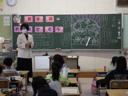 どの学級の黒板も、担任の先生から子どもたちに向けた熱いメッセージや、素敵な絵がかかれていました。学級開きでは特技を披露する先生もいました。