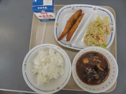 今日の給食は、ご飯、じゃがいもの味噌汁、和風サラダ、ししゃもフライ、牛乳でした。