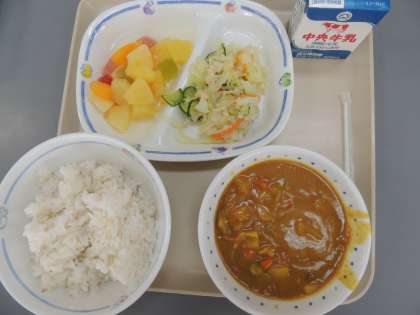 今日の給食は、麦ごはん、カレーライス、チキンサラダ、フルーツゼリーミックス、牛乳でした。