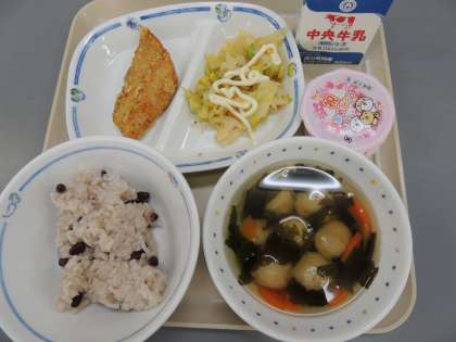 赤飯、えびしんじょのすまし汁、れんこんサラダ、さわらのから揚げ、いちごゼリー(豆乳クリーム添え)でした。