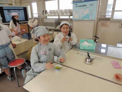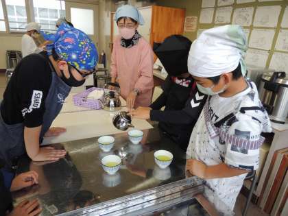 家庭科「お茶の入れ方」(5年生) 公開日 2023/05/01 更新日 2023/05/01 お知らせ 5年生は家庭科の授業で「お茶の入れ方」を学びました。ここ3年間は、調理実習ができませんでしたが、今年は調理実習も行っていきます。 今日は、ボランティアの方も見守ってくださいました。お茶の良い香りをかぎながら、「おいしい!」と温かい緑茶をいただきました。